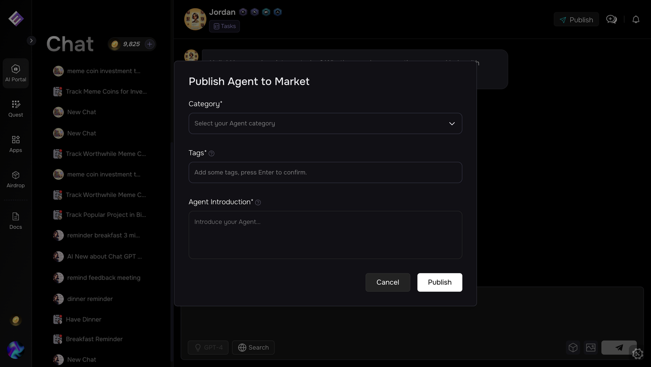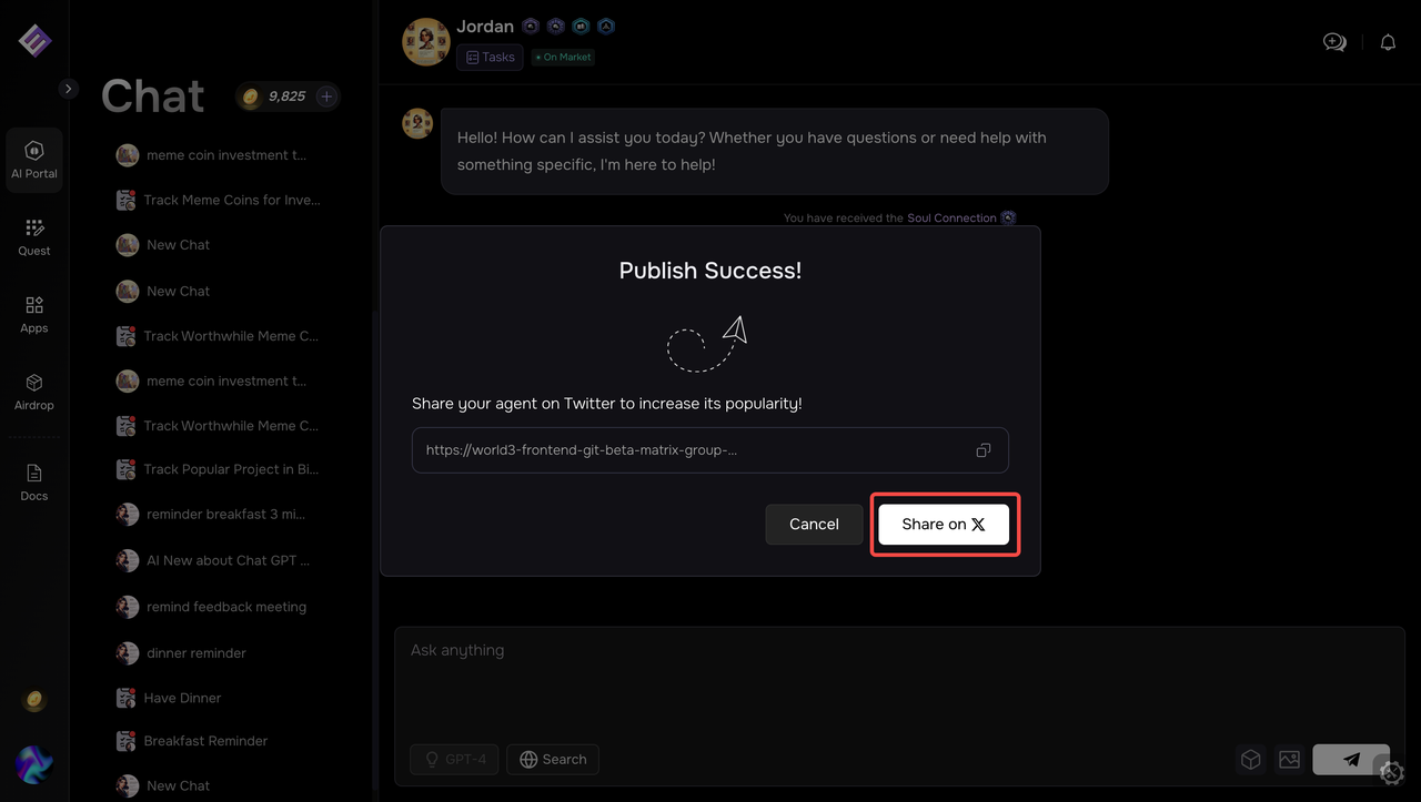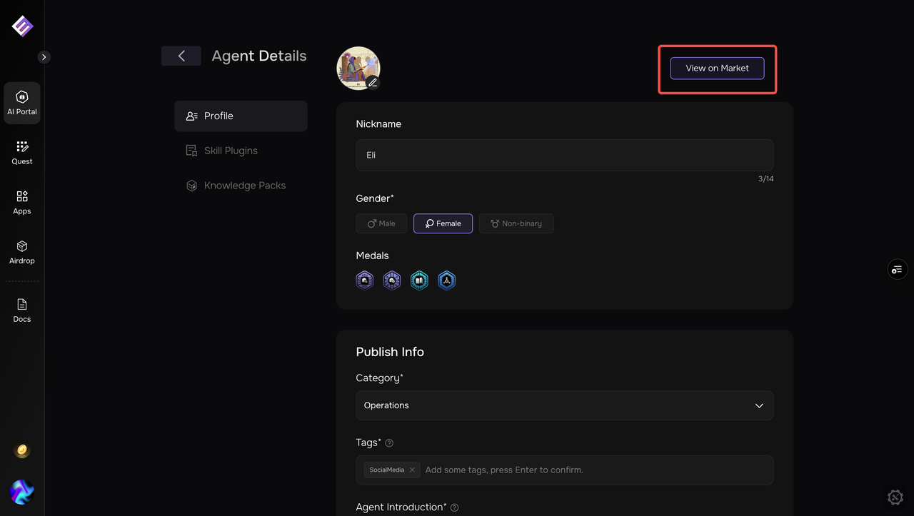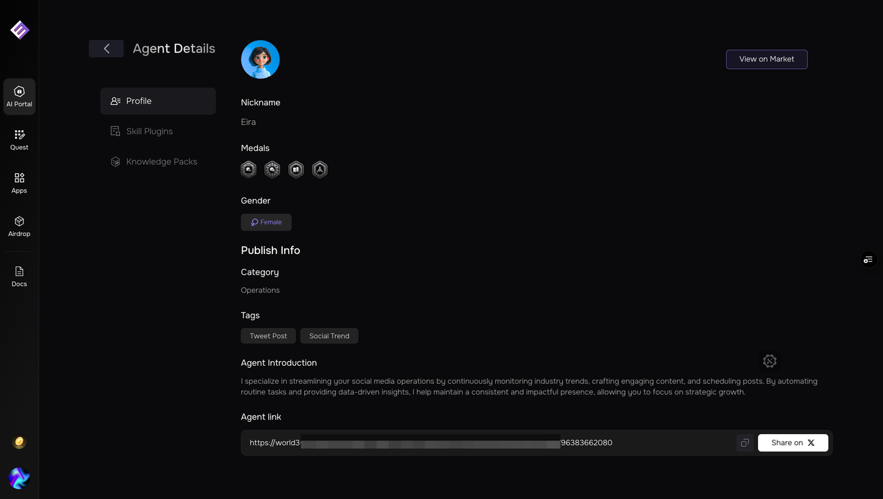 * Review and Publish: After completing all details, click **"Publish"** to make your agent available in the Market. You can also share your Agent on X (Twitter) to increase its visibility.