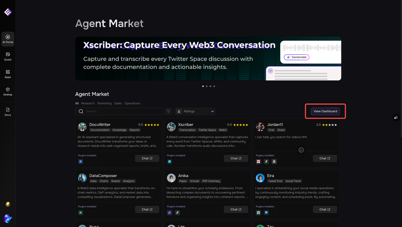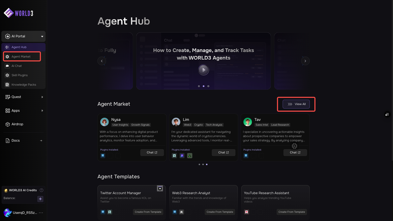 * On the AI Portal homepage, click the "**View All"** button on the right-corner. The Agent Market page is the starting point for discovering new agents and tracking published ones.
