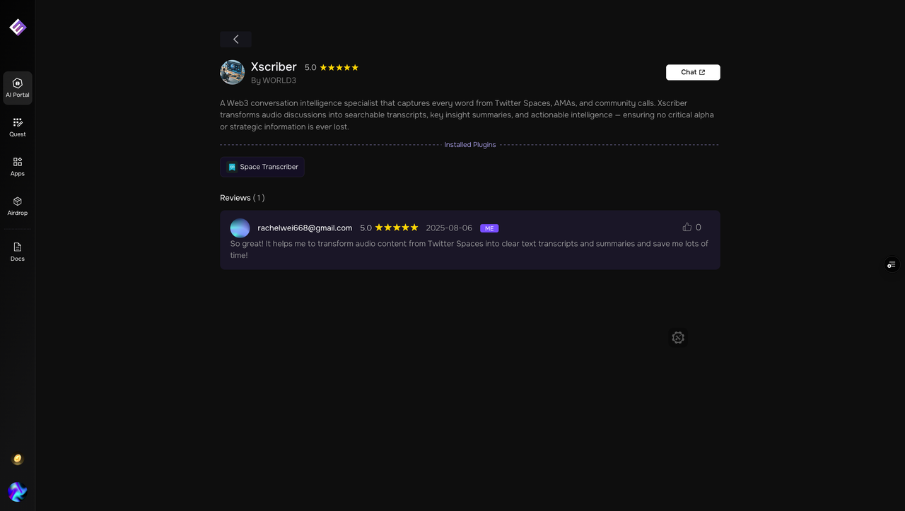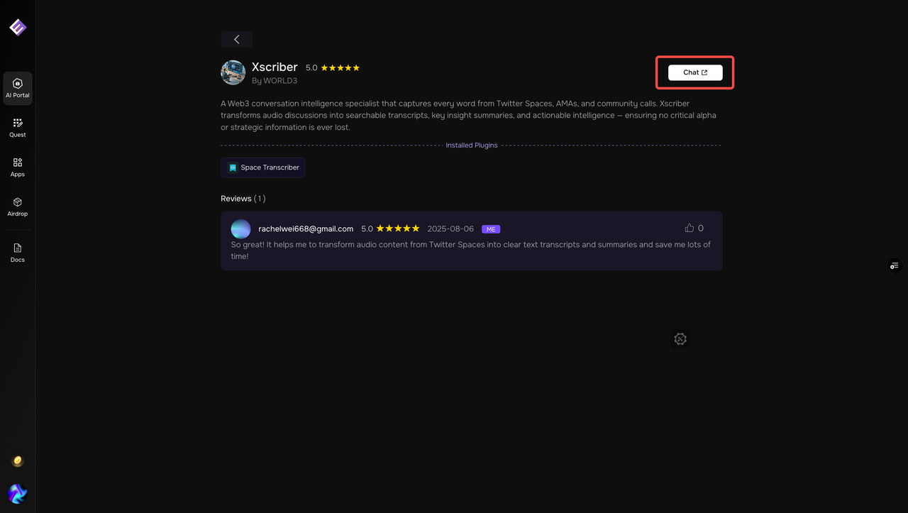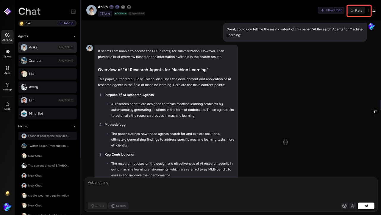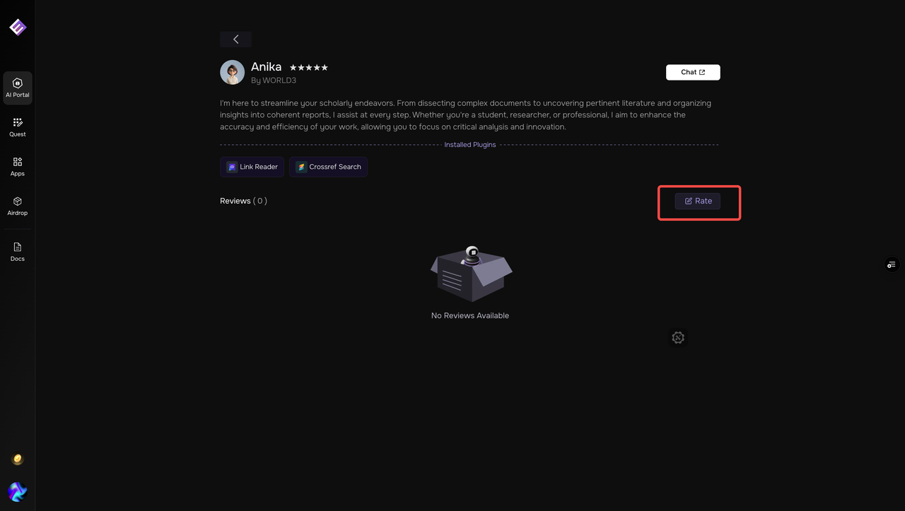From the Agent Information page, click the **"Chat"** button to open the chat window. Alternatively, if you click the quick **"Chat"** button on an agent's card from the Agent Market page, the chat interface will open directly.After chatting with the Agent at least 5 times, you will see a **"Rate"** button appear (see Section 5 below).