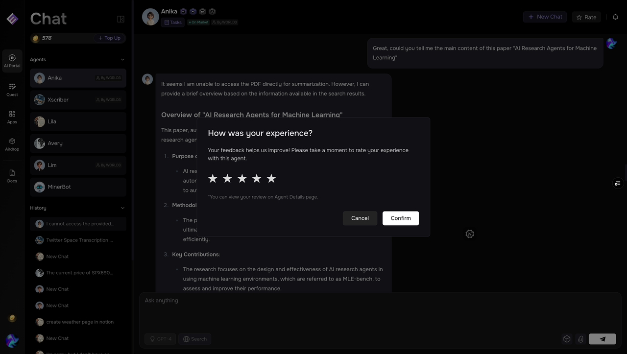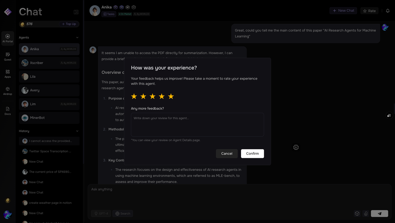 * **When You Can Rate:** In order to leave a rating/review for an agent, you must have chatted with the agent at least 5 times before you can submit a review. Additionally, you cannot rate an agent you created, and you can only review each agent once.
