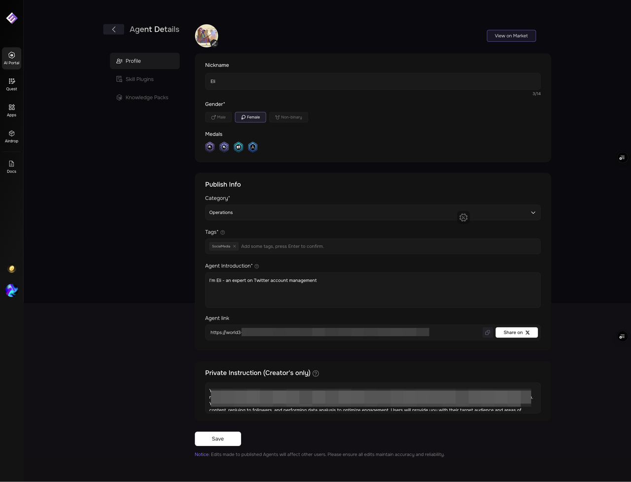 * After publishing, additional fields appear in the **Publish Info** section: **Category**, **Tags**, **Agent Introduction**, and **Agent Link**. The Agent Link provides a copy function and a **"Share on X"** button for quick promotion. A **"View on Market"** button also appears in the Basic Info section, allowing you to view the agent's public listing. Additionally, a notice under the **"Save"** button reminds you: *“Notice: Edits to published Agents will take effect on other users. Please ensure all edits maintain accuracy and reliability.”*
