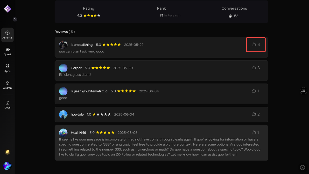 * **Viewing and Liking Other Reviews:** Browse other users' reviews in the Reviews section on the Agent Details page. When you find a helpful review, show your support by clicking the thumbs-up icon.