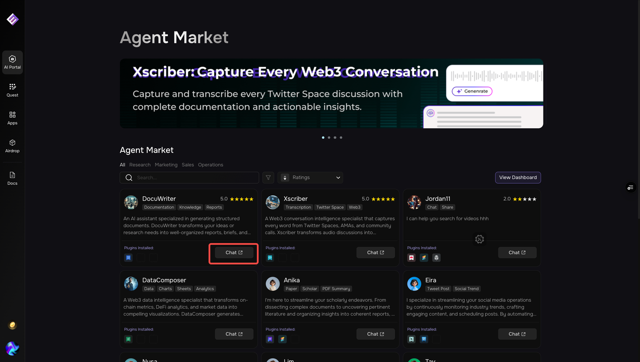 * Filters: Next to the search bar, you'll find filtering options to refine the Agent list by certain metrics. The Agent Market currently provides filters for: