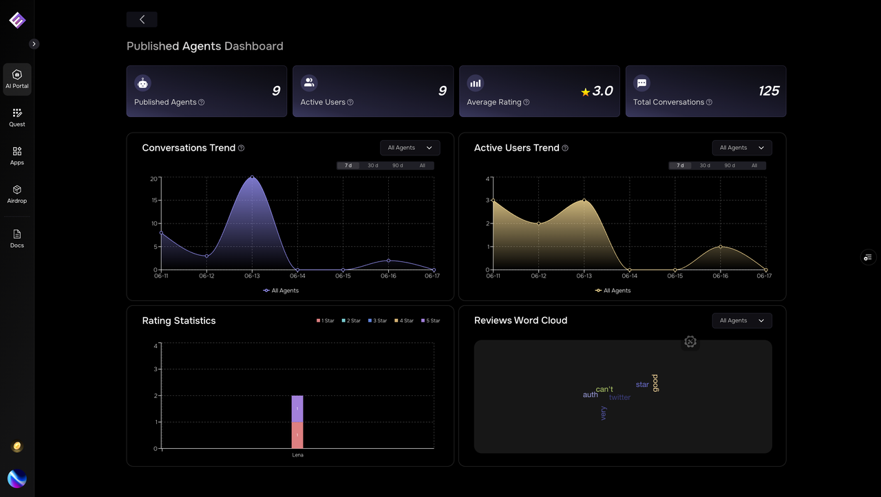 * Average Rating: The average star rating across all your published agents. This updates each time you access the dashboard.
