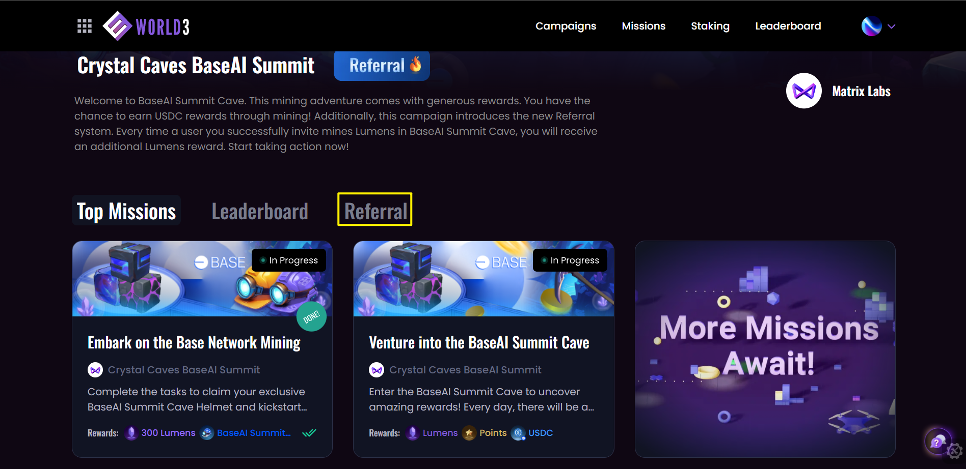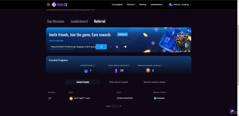 你可以邀请好友完成任务,后续好友完成特定的任务时,您都能获得额外的 Lumens 奖励。点击任务中的 Referral,进入邀请系统。