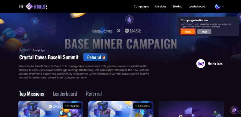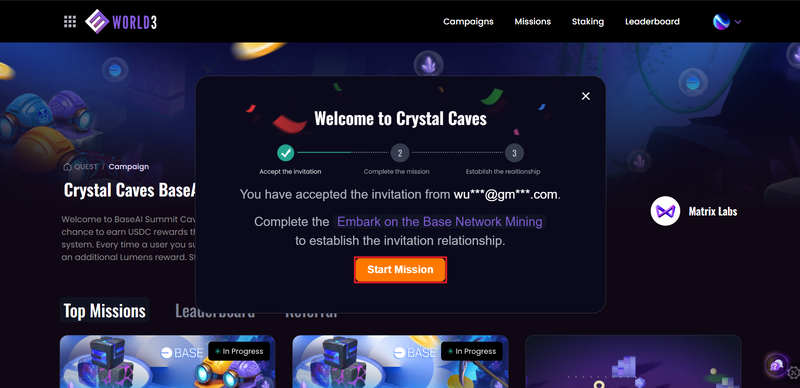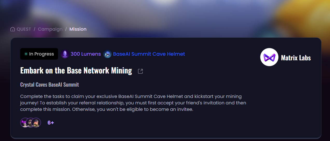 无论你是通过他人邀请的链接还是直接进入的 Crystal Caves BaseAI Summit,都需要完成该任务获取头盔以进行挖矿。关于邀请,请参考:邀请系统