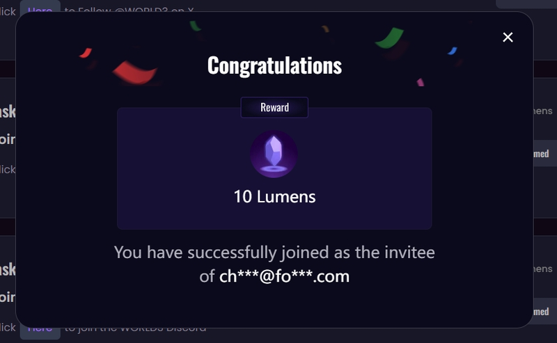 受邀用户完成 Misson 后,受邀人会获得10 Lumens 奖励,邀请人会获得 20 Lumens 的奖励,此时 Referral 关系构建成功。