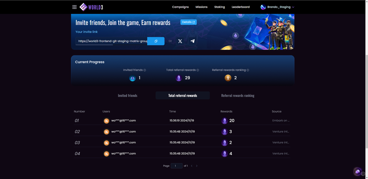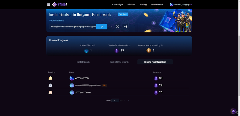在 “Referral rewards ranking” 内查看你通过 referral 获得的奖励排名。