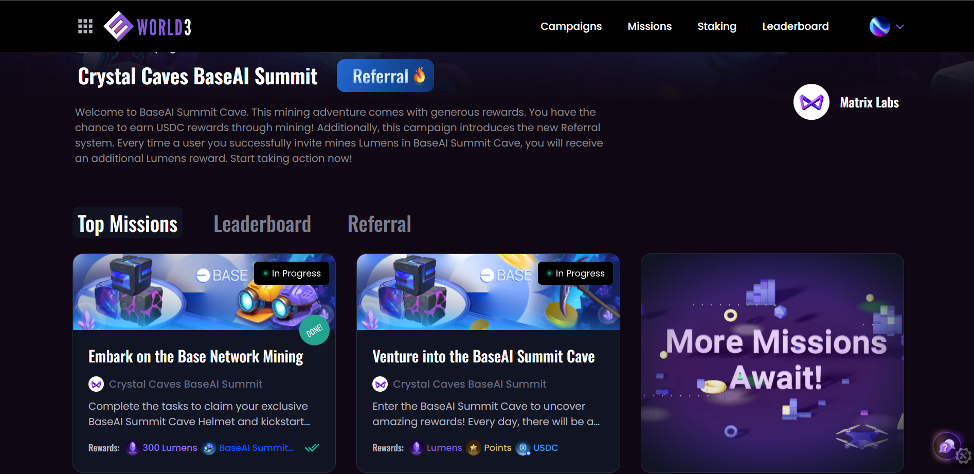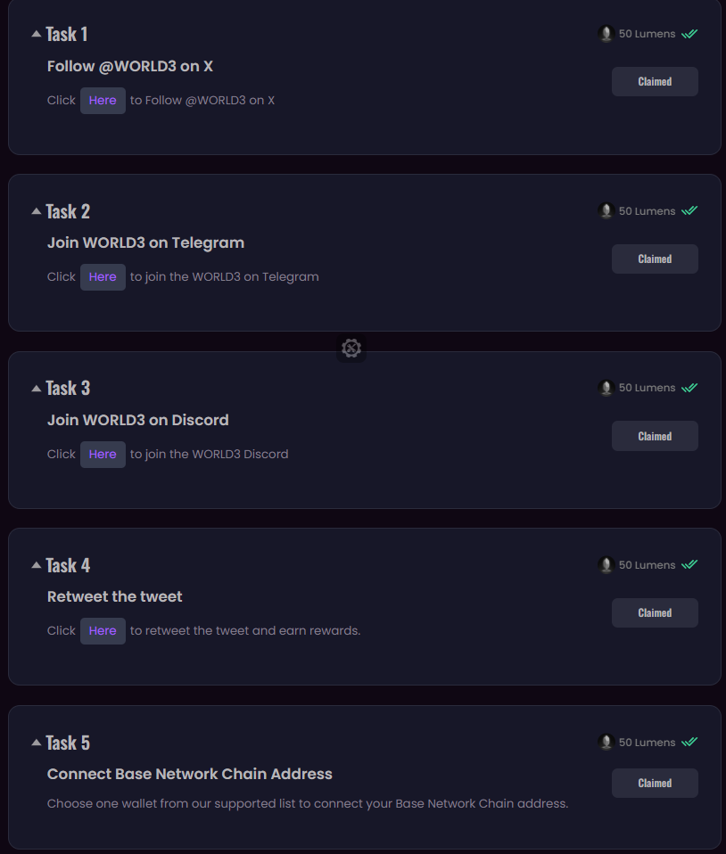 完成 WORLD3 BaseAI Summit Campaign 中的任务, 赚取 Lumens 和奖励!