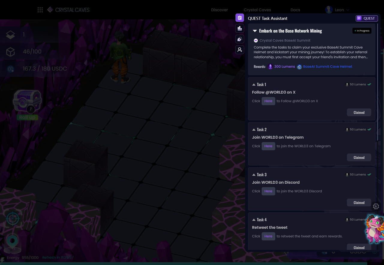 或者,您也可以从 Crystal Caves 游戏中访问 QUEST 任务。只需单击龙图标,如下图所示。这将直接在游戏中打开QUEST 任务助手,让您无需切换到单独的窗口即可访问并完成 WORLD3 BaseAI Summit 活动的任务。