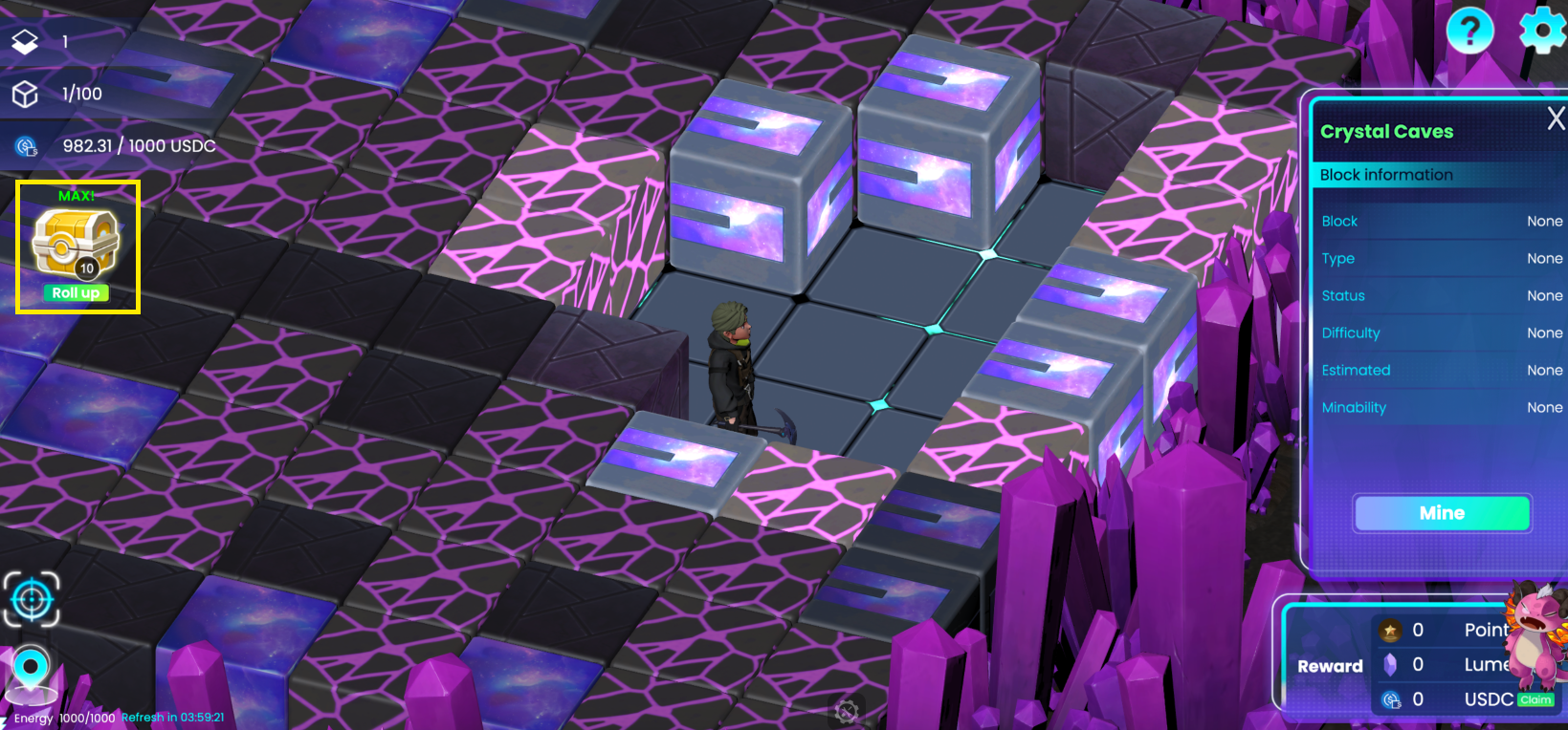 Roll up to Save Progress Players can mine up to 10 blocks at a time. After mining 10 blocks, a roll-up transaction occurs to sync the data on-chain and distribute rewards. This means that after mining 10 blocks, you need to open the Roll Up box on the left to distribute the rewards before you can mine more blocks.